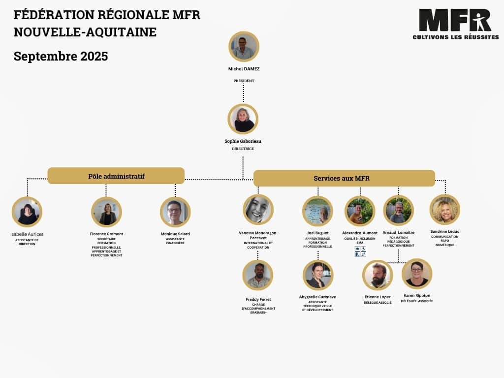 La Fédération Régionale des MFR Nouvelle-Aquitaine a un rôle d’impulsion et d’accompagnement de ces établissements dans leur développement, notamment sur les thématiques du perfectionnement du personnel et des administrateurs, de la formation professionnelle continue, de l’apprentissage, de la communication, et de l’ouverture à l’international (incluant la mobilité Erasmus+). Elle assure la professionnalisation et le maintien en compétence des membres du réseau.